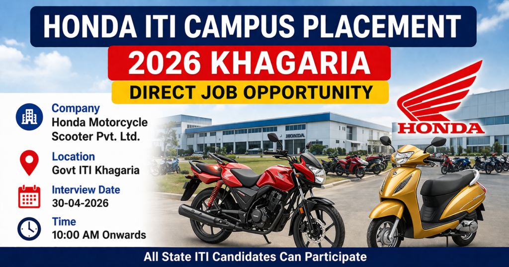 Honda ITI Campus Placement 2026 Khagaria is a major opportunity for ITI pass candidates who are looking to start their career in a reputed automobile company. This campus placement drive is being organized at Govt ITI Khagaria, where candidates will be selected through a direct interview process. The Honda ITI Campus Placement 2026 Khagaria provides a simple and fast hiring process, making it easier for freshers to get a job without going through complex exams or online applications.