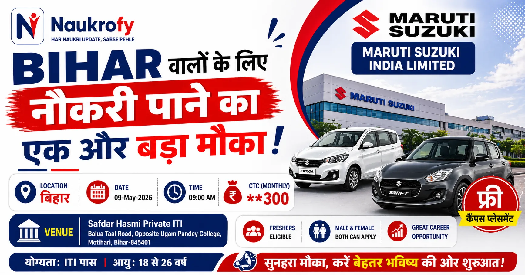 The Maruti Suzuki ITI Campus Placement 2026 is being conducted for hiring ITI candidates across multiple trades. This is a direct walk-in opportunity, so eligible candidates should not miss it.